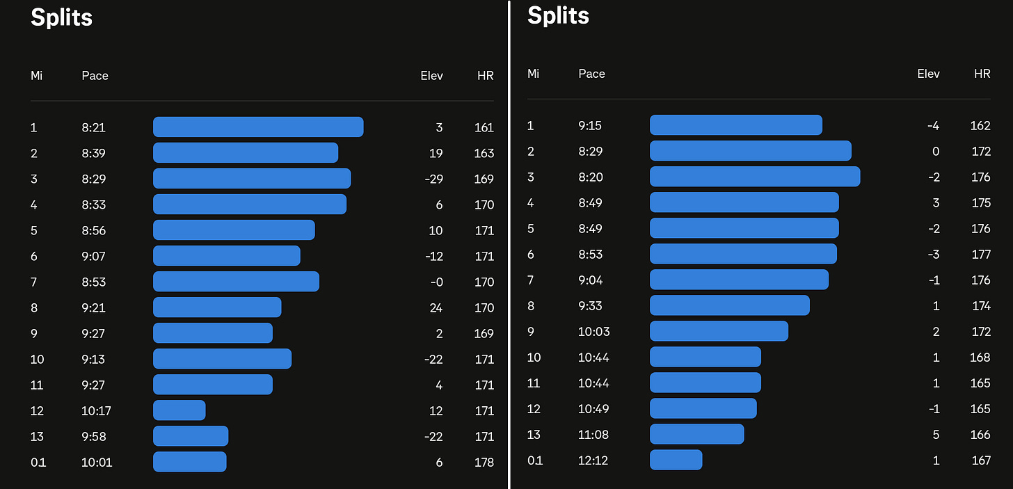 In both races, I was fairly consistent through the first seven miles, running between 8:30 and 9:10 pace. Notably, my heart rate during my first half marathon was 5–10 BPM higher at slightly slower paces.